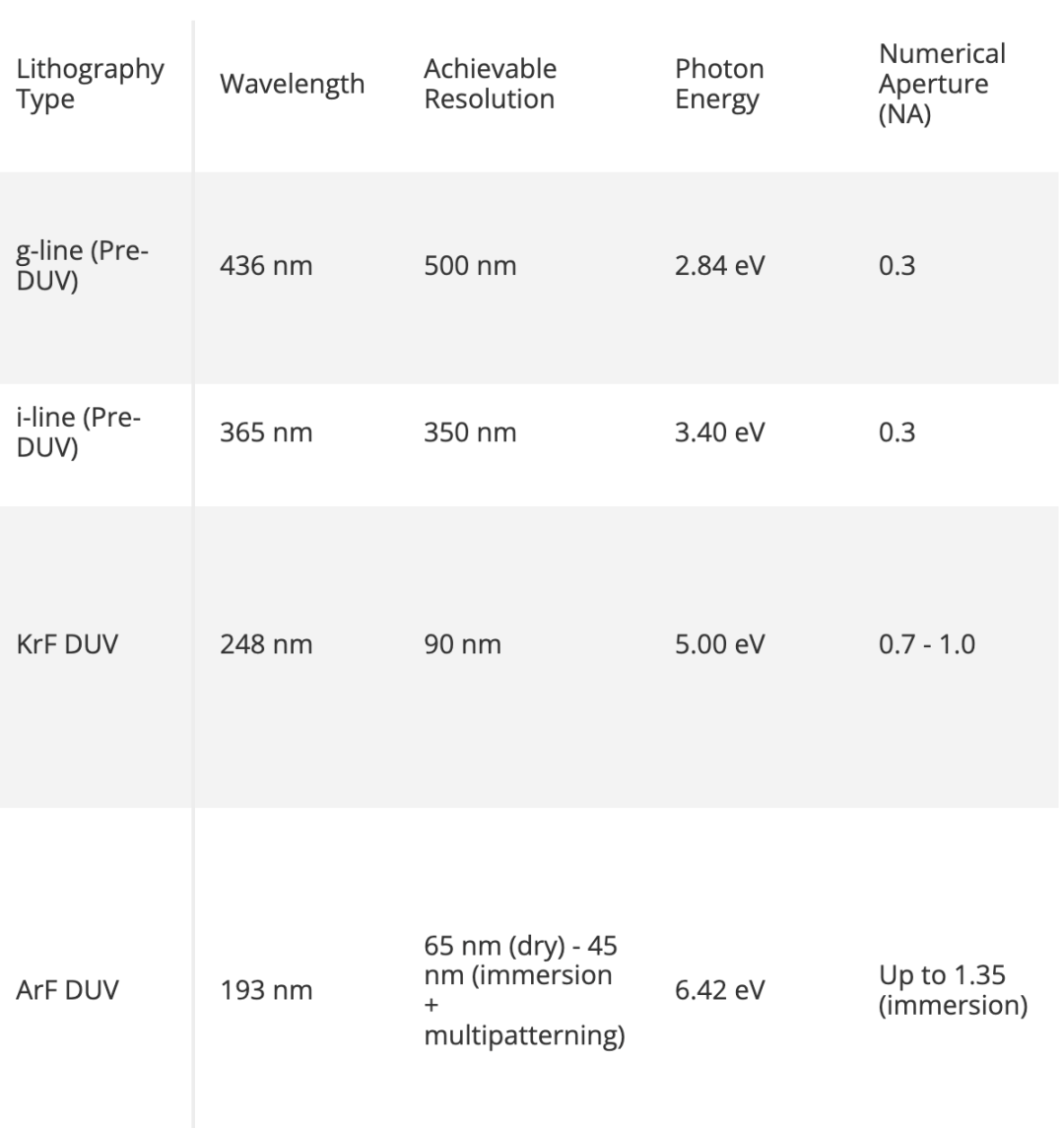 而之所以会是这样的演进步伐,则是科学家们基于对这些设备及物理原理考量实现的。以DUV和EUV为例,DUV 由准分子激光器产生。研究人员测试了大量气体以识别高发射效率的发射器。最终,他们得到了一些良好的发射器,如 KrF(248 nm)、ArF(193 nm)和 F2(157 nm),并基于它们开发了光刻机。