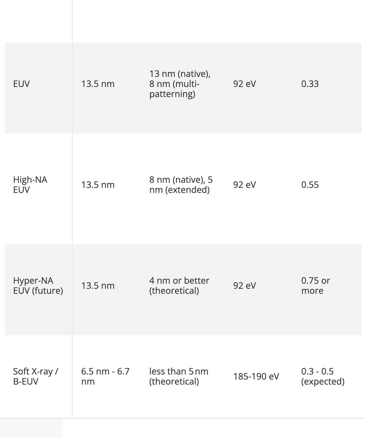 最后,这些光刻工具必须从零开始设计,目前还没有生态系统来支持这些设计,包括组件和耗材。总而言之,打造一台B-EUV机器(或软X射线机器?)需要在光源、投影镜、光刻胶,甚至像薄膜或光掩模这样的耗材方面取得突破。