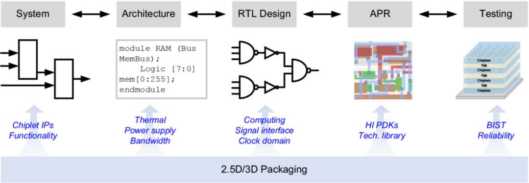在整个设计周期(包括设计工具、模型和工作流程)中,Chiplet和封装设计之间的紧密协作至关重要。系统架构师必须尽早参与设计过程,分析系统和封装,将设计划分为不同的Chiplet,并评估计算、数据移动和制造成本方面的必要权衡。此阶段的设计和验证工具(例如 SystemVerilog)需要整合封装设计和规划知识,以支持协同设计工作流程。这对目前分离的专用集成电路 (ASIC) 和封装设计流程而言,是一个重大的改进。此外,对 HI 系统进行早期预测分析对于最大限度地降低架构/微架构定义与设计实现之间的迭代成本至关重要。