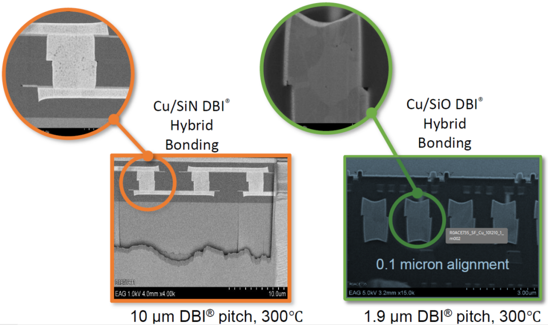 图2、10 µm 间距混合键合(左)和 1.9 µm 间距混合键合(右)