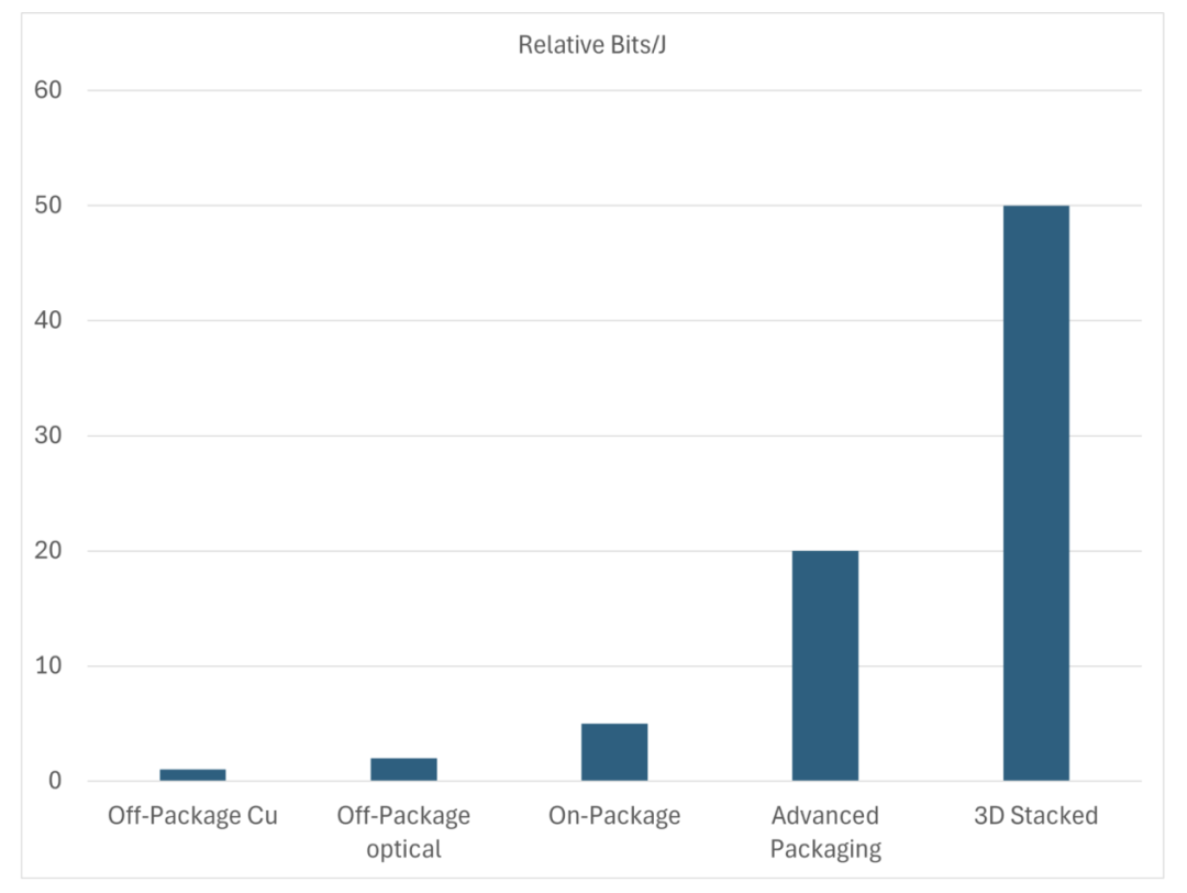 随着业界致力于开发针对特定应用定制的更高性能、更低功耗的解决方案,预计chiplet的普及将持续下去。下一代封装需要支持异构集成的爆炸式增长,实现互连,以容纳极细间距的 I/O 芯片(间距小于 10 µm)和极细的线/线距(线宽小于 1 µm)电路。总体而言,3D 芯片集集成的目标是实现两个基本性能要求:(1) 更高的效率(以bits/J为单位)(图3);(2) 更高的带宽密度(以 IO/mm 或 IO/mm² 为单位)(图 4和图5)。