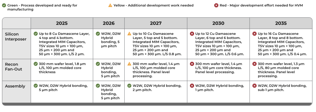 未来十年及以后,为了满足未来芯片性能对互连密度的极高要求,以及为了实现能效而降低功耗,同时保持信号和电源完整性,我们需要转向更精细的间距(< 10 µm)。组装技术和工艺需要从基于焊料的互连过渡到无焊料互连(Cu-Cu)。这一过渡将涉及硅堆叠解决方案和用于芯片到晶圆 (D2W) 或芯片到晶圆 (D2D) 混合键合的工具的开发。此外,混合键合工艺需要晶圆精加工设备,例如化学机械平坦化(或抛光;CMP),以及比典型的组装/制造生产线更清洁的环境。