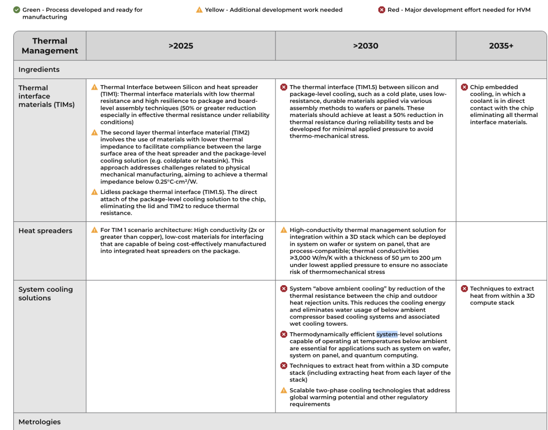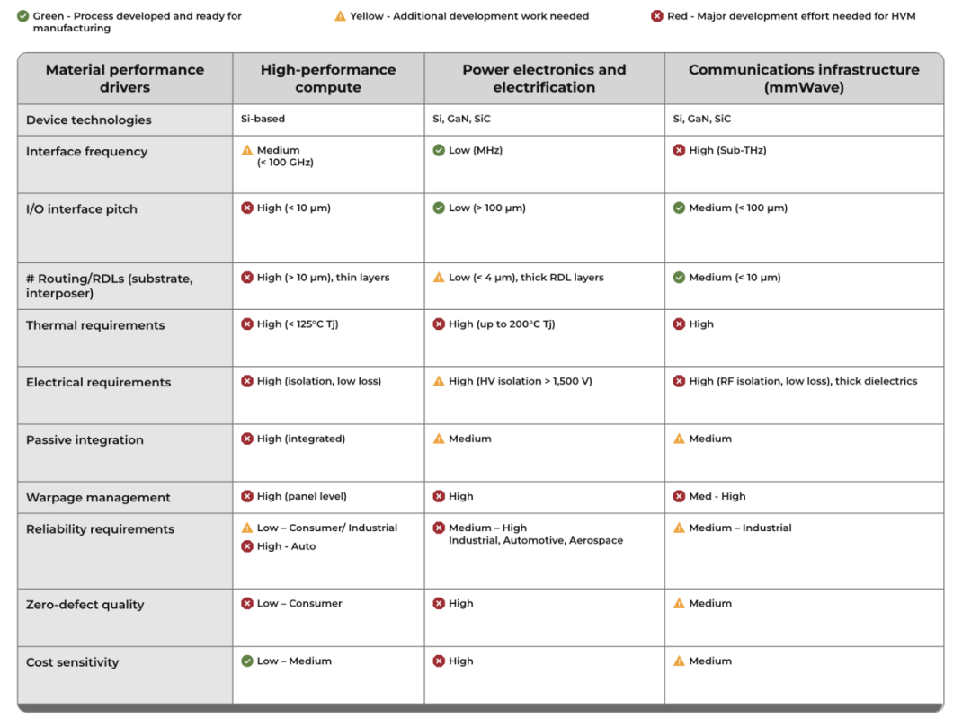 特定应用驱动因素,包括高性能计算、电力电子/电气化以及亚太赫兹通信基础设施,将用于定义新材料功能,以提升先进封装领域的系统级性能。重点领域包括:实现更高封装布线密度/小型化所需的材料改进、电气性能的提升,以及机械和热性能的提升,从而提高可加工性和可靠性。需要先进的散热解决方案,才能在器件最高结温、尺寸和成本的限制下实现系统级性能。封装平台需求涵盖从传统的层压板和引线框架封装到高密度倒装芯片/扇出型晶圆级封装和大幅面面板级封装,以实现下一代产品的成本和性能目标。