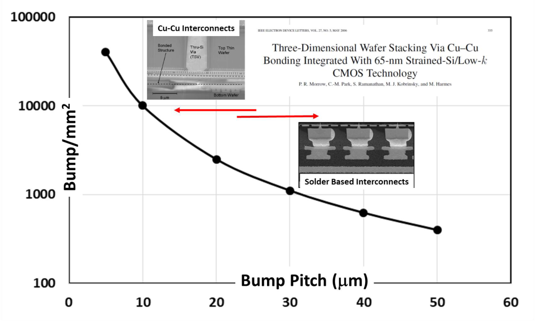 图4:互连面密度(凸点/mm² )与凸点间距的关系。缩小凸点间距需要从基于焊料的互连过渡到铜到铜的互连。