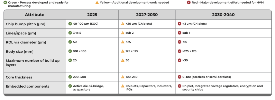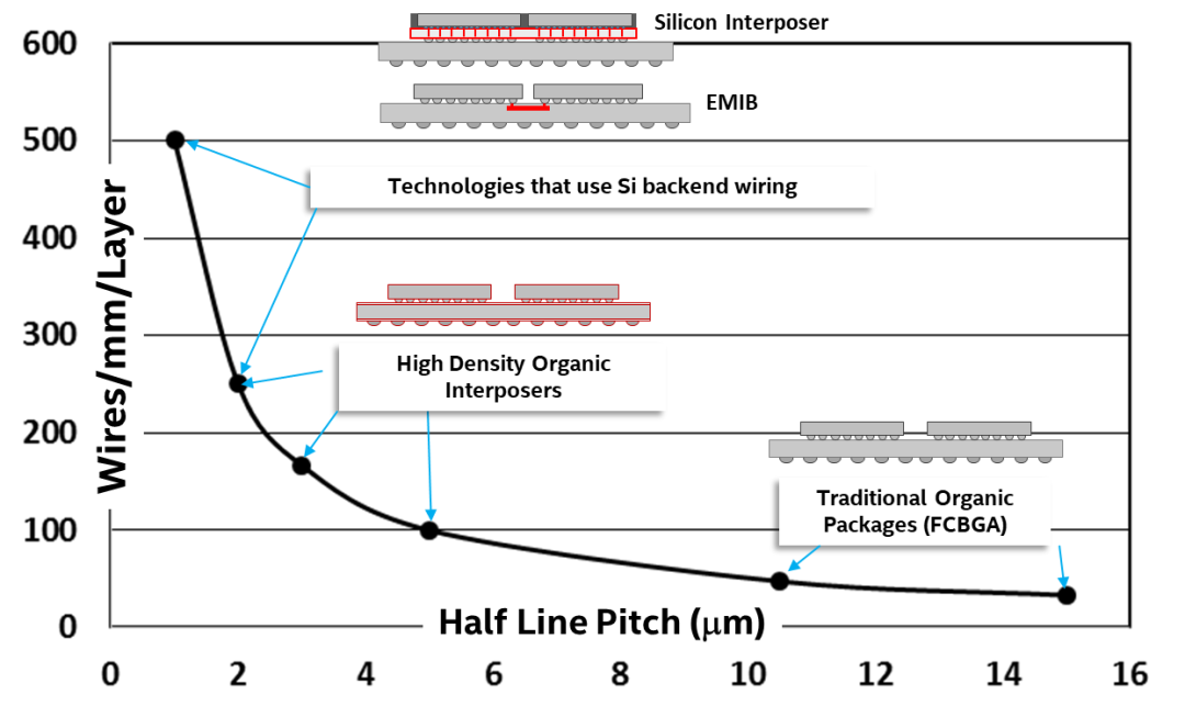 图 5:每毫米每层的线数与半线间距(μm)的关系,展示了不同中介层和基板技术的线性布线能力范围。以上是先进基板在高密度和高性能应用方面的两个关键微缩要素