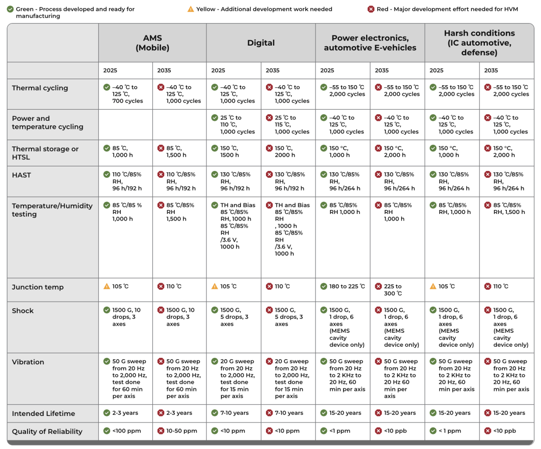 集成式芯片 (HI) 正在横向和纵向发展,包括 3D 键合、混合键合、嵌入式桥接以及其他先进技术,并采用新材料、创新工艺和测试协议。然而,随着对更高功能、更高性能和更高功率的需求与对更小尺寸、更轻重量和更低成本的需求的增加,可靠性和测试挑战也随之而来。这些先进封装的可靠性对于实现这些技术至关重要。因此,表 7 中的资格指标在未来 10 年内不会发生显著变化,但会显示为红色,特别是因为如果这些新材料、新工艺和新尺寸在设计过程中没有预先考虑可靠性,那么满足相同的可靠性指标将非常困难。