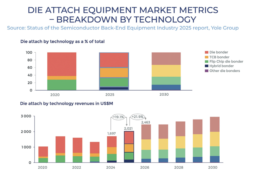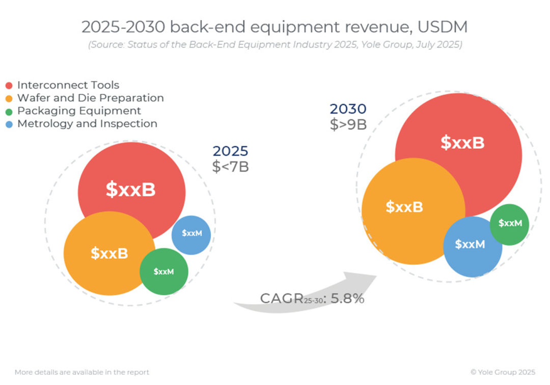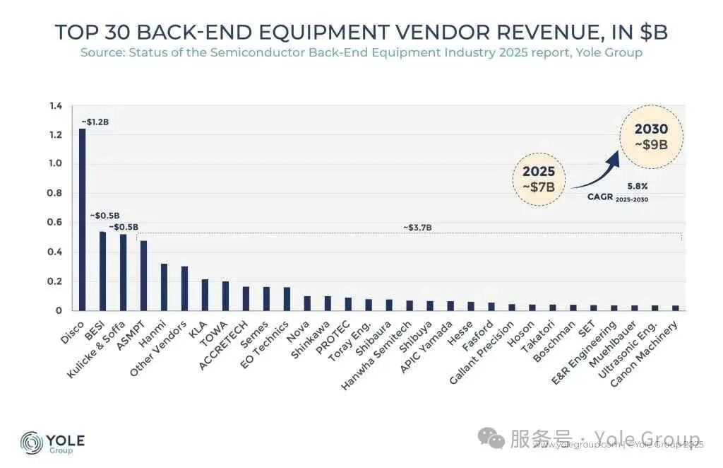 先进封装市场的火热也点燃了先进封测设备的发展浪潮。Yole Group 在报告中指出,2025 年后端设备总收入约70 亿美元,预计到 2030 年将超过90亿美元,年复合增长率接近 6%。