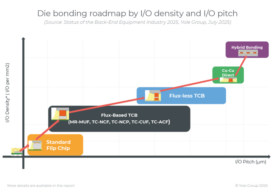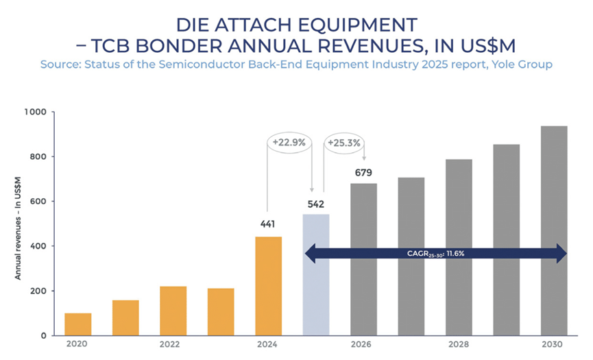 Yole Group指出,热压键合(TCB)市场将在2030年达到9.36亿美元,将实现11.6%的年复合增长率,主要由内存与AI平台的集成需求推动。