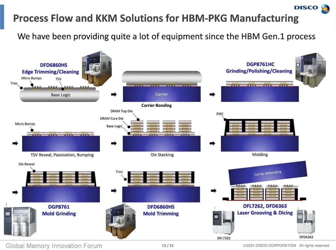 以HBM为例,在HBM技术中,TSV(硅通孔)工艺是核心,通过三维堆叠芯片来提升连接效率。DISCO为TSV提供了全面的技术支持,包括晶圆切割、研磨和抛光等关键工艺,凭借其先进的DBG(切割+研磨)技术和SDBG技术,能够成功解决在裸片制造过程中高精度和高效能的要求,确保芯片在堆叠过程中能够保持高精度和高效性,实现HBM等芯片的批量生产。