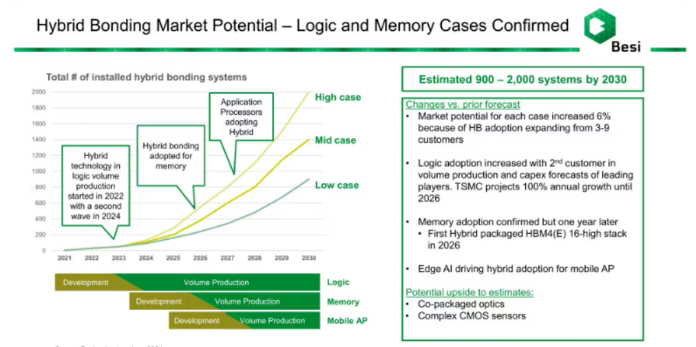 随着先进制程逼近物理极限,芯片制造商正转向异构集成与3D封装技术以提升性能。混合键合凭借其高密度互连与低功耗优势,被视为替代传统微凸点技术的关键方案。这将直接推动Besi在逻辑与内存应用领域的先进封装解决方案需求增长。