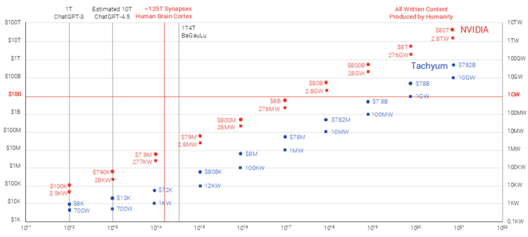 如Tachyum所说,传统的大规模人工智能解决方案可能耗资超过 8 万亿美元,需要超过 276 GW的电力。相比之下,Tachyum 的解决方案预计仅需 780 亿美元的成本和 1 GW的电力即可实现类似的功能,使其能够被多家公司和国家所采用。Tachyum认为,公司的Prodigy 系列产品能股改多种性能和应用领域,包括大型人工智能、百亿亿次级超级计算、高性能计算 (HPC)、数字货币、云计算/超大规模计算、大数据分析和数据库。