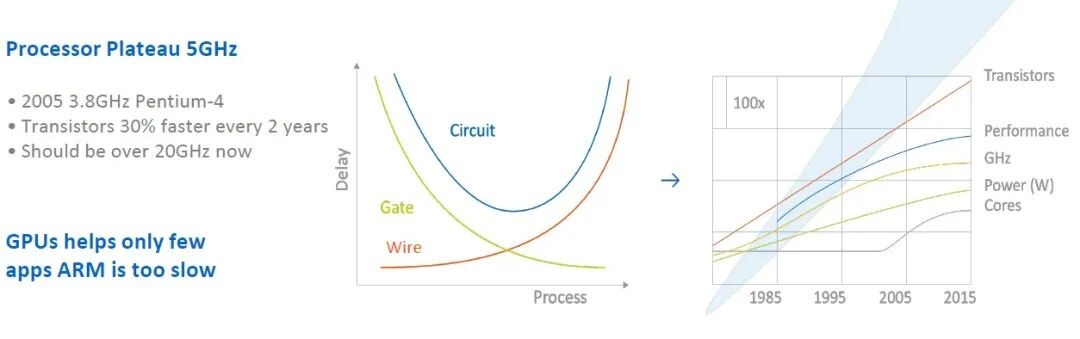 “我们在时钟频率附近遇到了性能瓶颈,每个核心的性能增长并不显著,”Danilak表示。“核心数量在增加,但由于散热问题,我们也在降低时钟频率。所有晶体管的速度都在提高,但问题在于导线变得越来越细,电阻越来越大,因此导线延迟也在增加。过去芯片的延迟是每毫米100皮秒,而现在每毫米的延迟已经接近1000皮秒。”