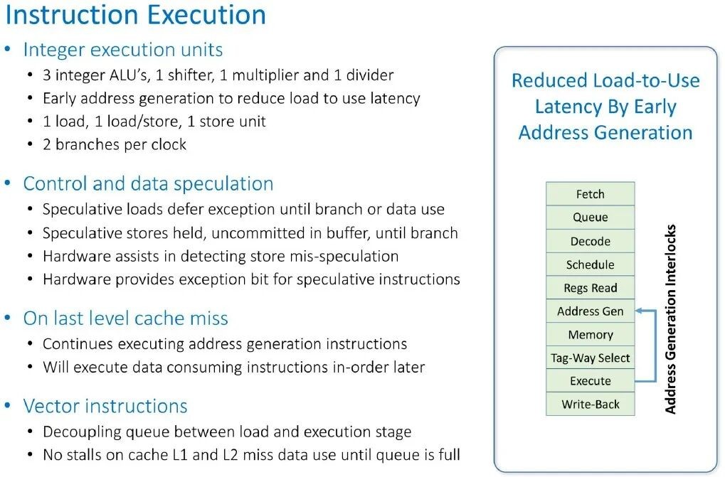 与其他核心设计相比,L1缓存略小,数据缓存和指令缓存均为16KB,但核心上的256KB L2缓存和同样位于核心上的512KB L3缓存(两者共同构成一个覆盖整个芯片的32MB共享L3缓存)则完全正常。如您所见,整数流水线有九级,向量流水线则增加了五级。