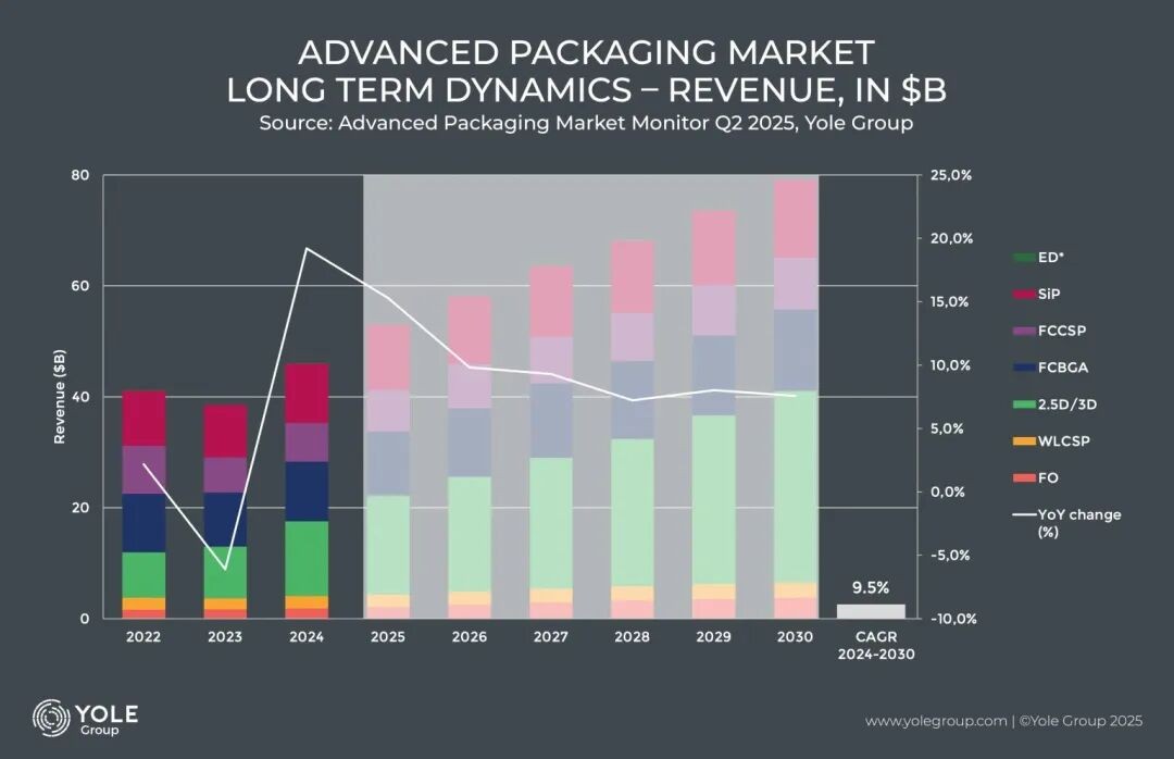 而在AI芯片的先进封装领域,台积电、英特尔和三星已经形成了“三强鼎立”的格局。由于自身定位不同,这三家公司在产业链中也承担着不同的封装角色。据Yole Group的分析,短期来看,2025年第二季度先进封装收入将超过120亿美元。在人工智能和高性能计算强劲需求的推动下,预计下半年市场表现将更加强劲。长远来看,2024年先进封装市场规模约为450亿美元,预计将以9.4%的强劲复合年增长率增长,到2030年达到约800亿美元。