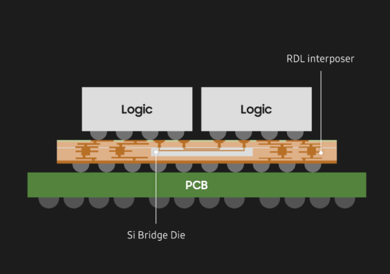 I-Cube E则是使用Si Bridge + RDL Interposer的混合型低成本方案。如下图所示,它没有整块硅中介层,取而代之的是RDL Interposer(扇出型重布线中介层),下层用 Si Bridge Die(小尺寸硅桥) 提供局部高密度互联,类似英特尔EMIB的概念。