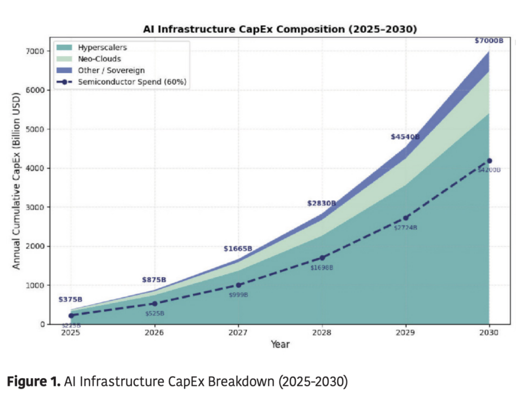 人工智能 (AI) 正通过前所未有的硬件驱动型投资超级周期重塑全球技术格局。到 2030 年,用于 AI 优化数据中心的资本支出 (CapEx) 预计将超过 7 万亿美元,这一规模是以往任何计算转型都无法比拟的。这一激增反映了两大结构性转变的融合:生成式 AI 模型的产业化以及能够训练和服务万亿参数系统的超大规模计算园区的物理建设。仅超大规模数据中心运营商就占了其中的 3200 多亿美元,亚马逊投入约 1000 亿美元,微软 800 亿美元,谷歌 750 亿美元,Meta 650 亿美元 。剩余部分则来自主权国家倡议和专业基础设施提供商,其中包括由 AI 公司和主权财富投资者组成的财团支持的 5000 亿美元的 Stargate 计划(图 1)。