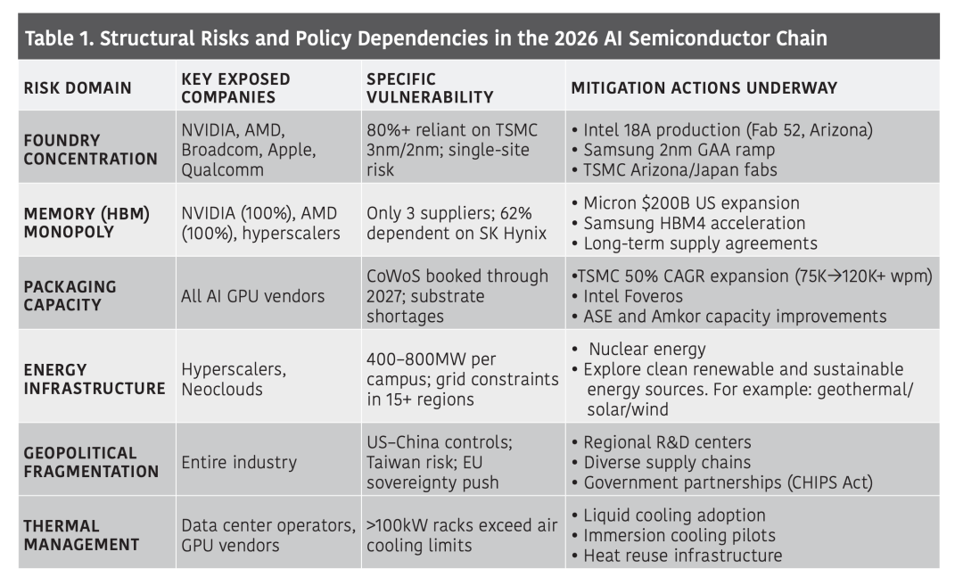 (3) 生态系统协调,政策制定者推动开放式代工厂准入和关键材料回收利用。然而,集中风险依然存在,过度依赖台积电的先进逻辑芯片和SK海力士的HBM内存会造成结构性脆弱性,而中美出口管制和监管碎片化只会加剧这种脆弱性。