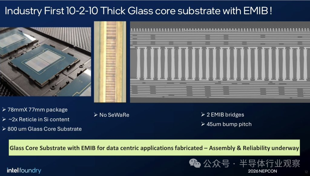 在2026年NEPCON日本电子展上,Intel展示了结合EMIB(嵌入式多芯片互连桥接)与玻璃基板的最新封装样品。这一举动打破了市场对其玻璃基板技术退场的疑虑,展现出在多芯片互连领域的技术野心。