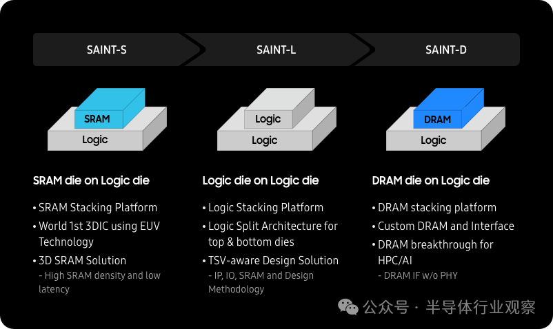 此外,依托自身在存储领域的优势,三星还推出了SAINT技术体系,聚焦存储芯片与逻辑芯片的协同封装,通过创新3D堆叠方案,构筑独特竞争力。目前细分为三大针对性方案: