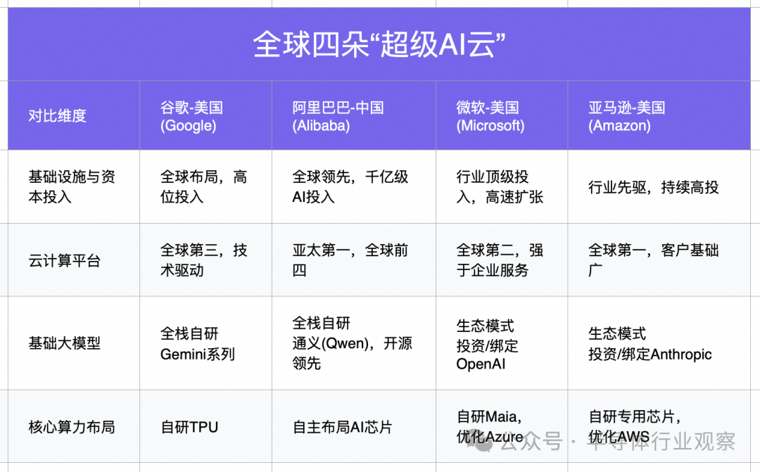如果你对整个国际AI市场的现状有所了解,你就能理解拥有这种布局,对阿里巴巴意味着什么。如下图所示,全球AI企业竞争加剧,亚马逊、微软、谷歌和阿里巴巴组成的"四强"格局占据了超过80%的云平台市场份额。为了在这个市场中尽可能取得占有优势的位置,他们在大模型、基础设施以及底层算力芯片上明争暗斗。但仅有谷歌和阿里实现了全栈自研的布局。
