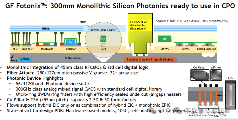 GlobalFoundries在硅光芯片领域积累深厚。早在2022年3月,GlobalFoundries就推出了硅光子平台Fotonix,是业界首个将300毫米光子学特性和300Ghz级别的RF-CMOS工艺集成到硅片上的平台,使得光子芯片能够提供更快、更高效的数据传输和更优的信号质量,旨在解决数据中心与AI时代对高速、低功耗、高带宽的严苛需求。