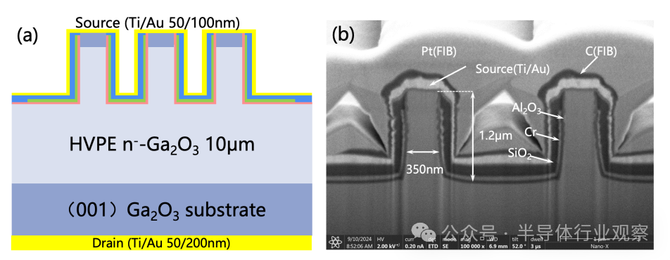 增强型垂直晶体管——破解"常开"难题图(a) 多鳍通道 β-Ga₂O₃ FinFET示意图,(b)鳍宽300 nm二极管 SEM 横截面图像
