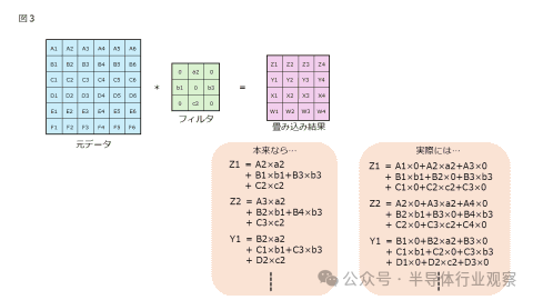 另一点需要指出的是,SIMD 结构本身难以处理稀疏性(稀疏矩阵)。稀疏矩阵是指元素包含“0”的矩阵。图 3 是图 2 的修改版本,其中滤波器的元素为零。在这种情况下,理想情况下计算量应该显著减少,如图中下方所示,但实际上,计算中却包含了不必要的零乘法和零加法,如图中右下角所示。如果可以省略这些操作,计算效率会更高,但这在常规矩阵计算中很难实现。