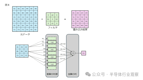 本质上,当多个执行单元(通常称为 PE:处理器元件)按顺序连接时,其机制是“当前一个 PE 的输出到达时,它将其作为输入并开始处理,处理完成后,它进入等待状态”。利用这一机制,例如,可以非常轻松地实现使用稀疏矩阵的卷积(图 4)。系数为 0 的 PE 根本不接收输入(因此它们不工作,从而降低了功耗),并且由于它们不产生结果,因此不会发生不必要的加法运算。