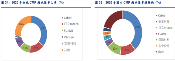 抛光液当前的全球主流供应商为卡博特(Cabot)、日立(Hitachi)、FUJIMI、慧瞻材料(Versum)等,垄断全球近65%的市场份额,根据Cabot数据统计,2020年龙头企业Cabot抛光液全球市场占有率达36%,在中国市场内占比达39%,国内代表企业安集科技在国内市场中占13%份额,其余48%为其他海外企业占据。而当前的国内晶圆厂需求除了安集科技以外,主要依赖进口。